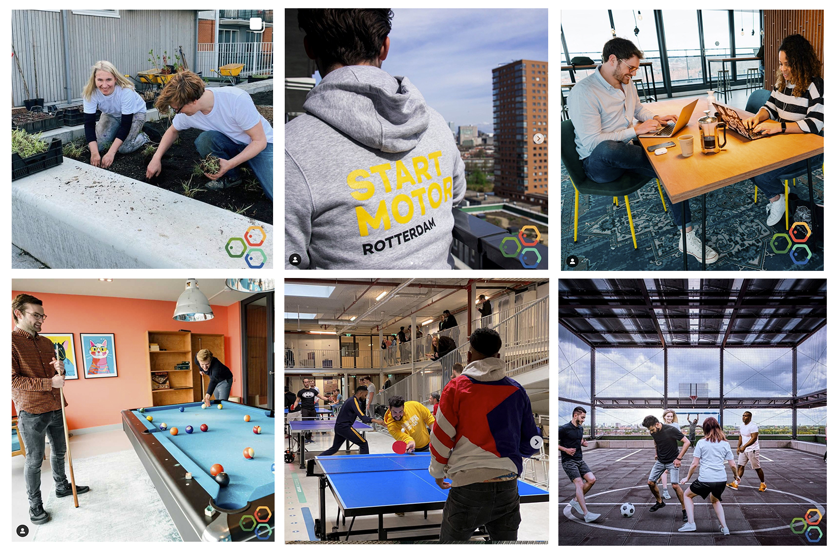 Startmotor Rotterdam is een complex met 600 woonunits voor jongeren. Het 13 verdiepingen tellende gebouw heeft een dakterras met BBQ-plek en keuken, sportdak, tuinierdak, binnenplaats, klusruimte, fitness en op elke verdieping een gedeelde ruimte.